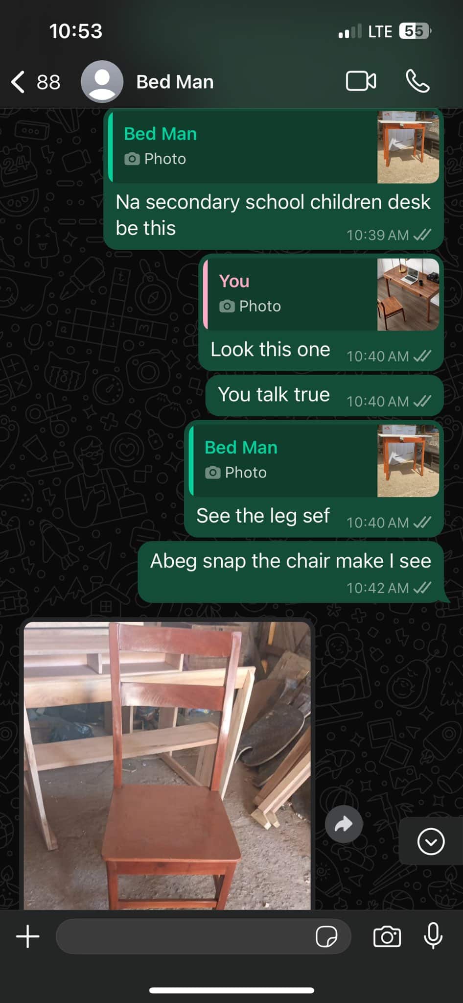 According to him, the desk and chair the carpenter had made looked more like that of secondary school.