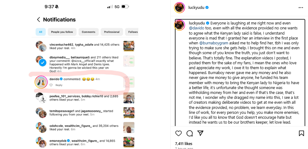 “Everyone is laughing at me right now and even @davido too, even with all the evidence provided no one wants to agree what the Kenyan lady said is false, I understand everyone is mad that I granted her an interview in the first place when @burnaboygram asked me to help find her, tbh I was only trying to make sure she gets help. I brought this on me and even though some of you know the truth, you just don’t want to believe. That’s totally fine. The explanation videos I posted, I posted them for the sake of my fans, I mean the ones who love and appreciate my work, I owe it to them to explain what happened. Burnaboy never gave me any money and he also never gave me money to give anyone, he funded his team member with money to bring the Kenyan lady to Nigeria to have a better life, it’s unfortunate she thought someone was withholding money from her and even if that’s the case, that’s not me, I wonder why she dragged my name into this, I see a lot of creators making deliberate videos to get at me even with all the evidence provided, no problem, we learn everyday. In this line of work, for every person you help, you make more enemies, I’d like you all to know that God doesn’t encourage hate but instead he wants us to be our brothers keeper, let love lead.”